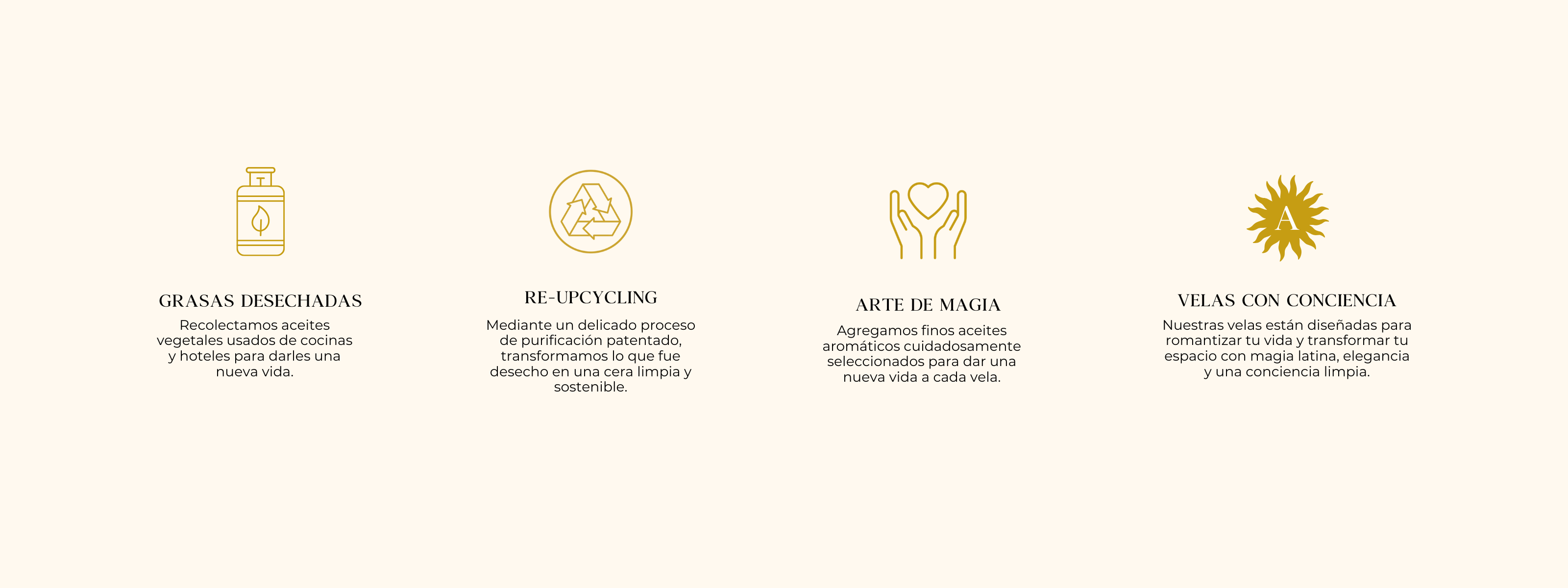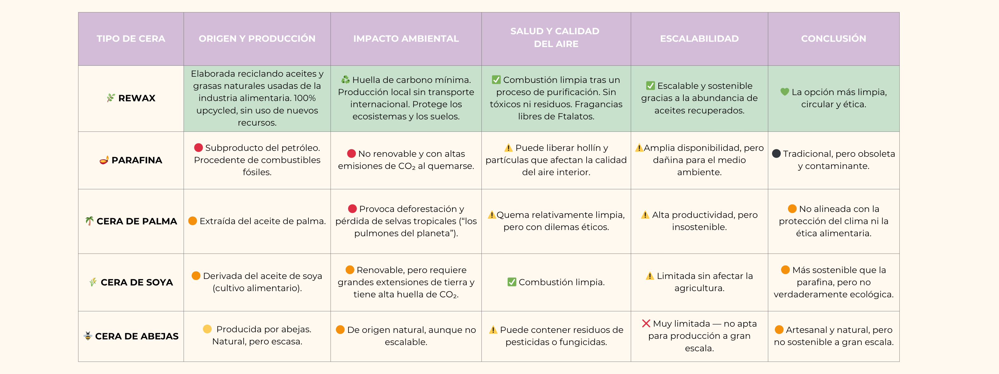 Nuestras velas perfumadas están hechas de REWAX, una cera altamente purificada creada mediante un proceso patentado que recicla aceites y grasas recuperados de la industria alimentaria y hotelera para convertirla en la cera de nuestras velas, a las cuales se le adiciona esencias naturales para lograr la más alta calidad.